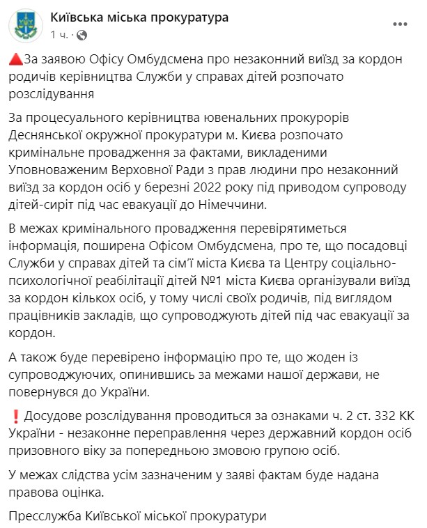 Правоохранители проверят информацию, что должностные лица Службы по делам детей и семьи города Киева и Центра социально-психологической реабилитации детей №1 города Киева организовали выезд за границу нескольких лиц, в том числе своих родственников, под видом работников учреждений, сопровождающих детей при эвакуации за границу. А также будет проверена информация о том, что ни один из сопровождающих, оказавшись за пределами нашего государства, не вернулся в Украину.