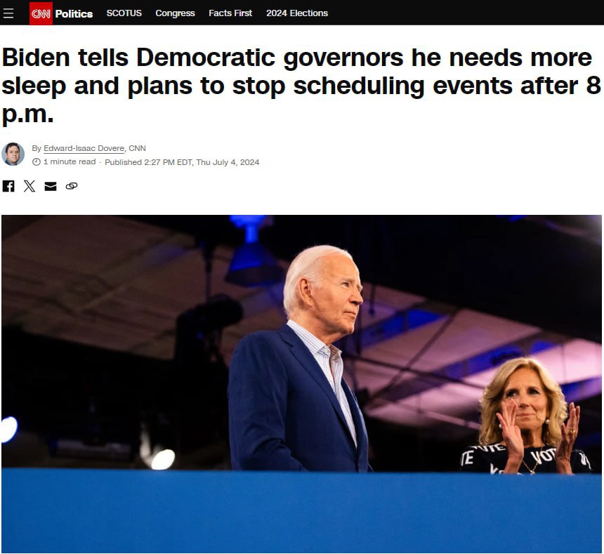 Ранее портал Axios со ссылкой на источники в окружении главы Белого дома написал, что работоспособность Байдена ограничена несколькими часами дневного времени.