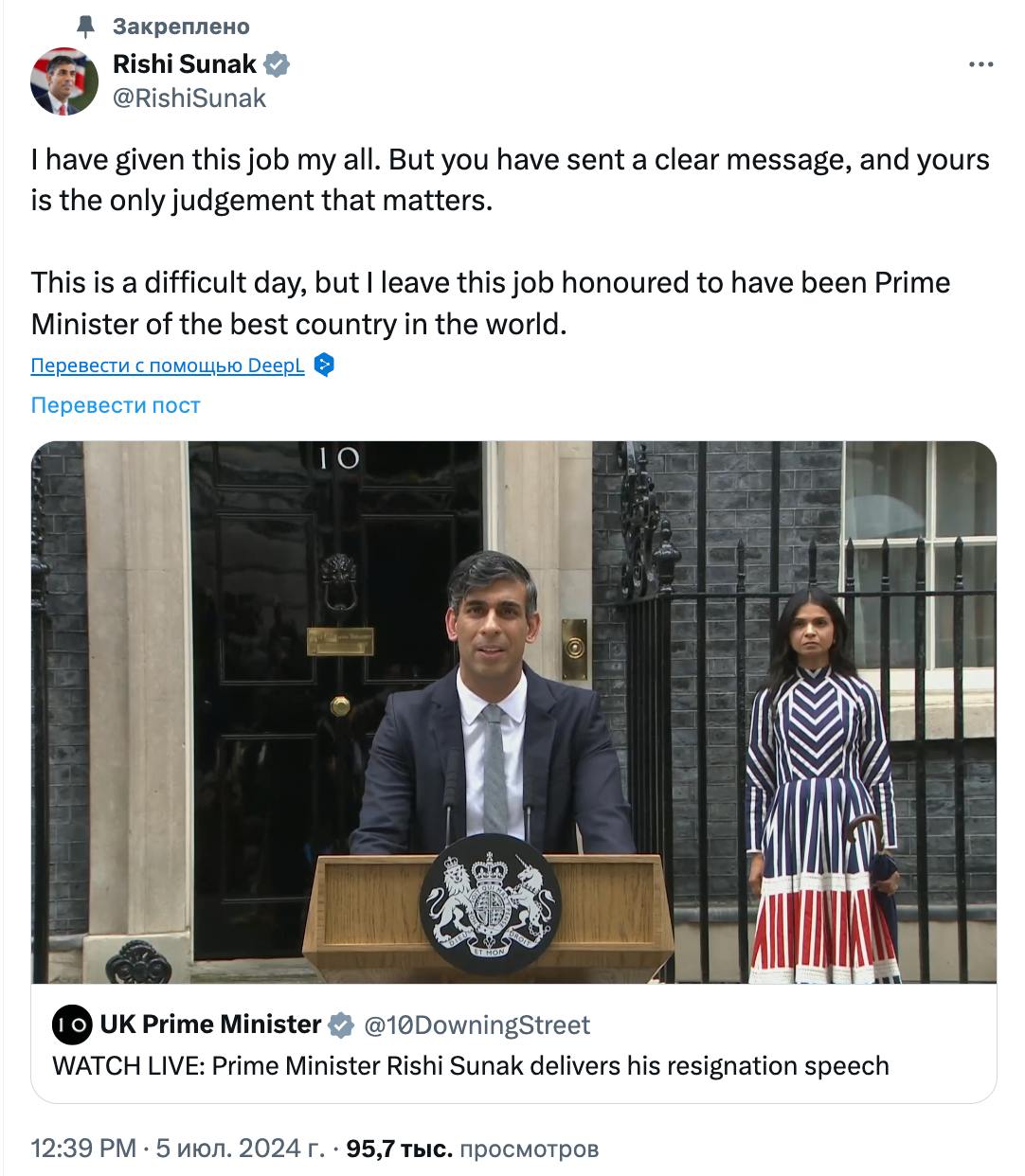 "Я отдал этой работе все силы. Но вы послали четкий сигнал, и только ваше мнение имеет значение. Это трудный день, но я покидаю этот пост с честью быть премьер-министром лучшей страны в мире", - написал Сунак.
