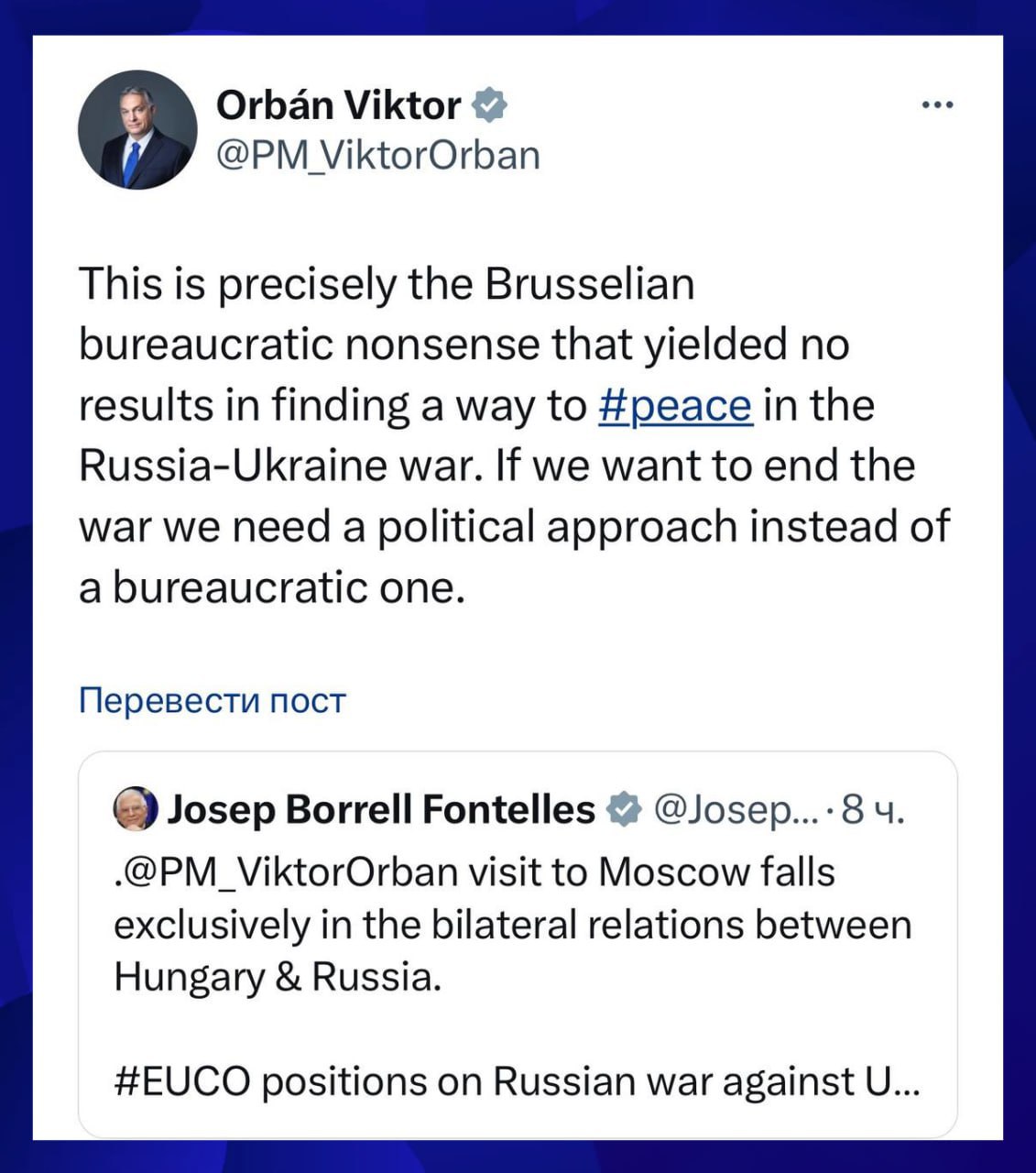 "Это из-за бюрократического бреда Брюсселя усилия по установлению мира в Украине не имеют результатов", – отреагировал Орбан, комментируя твит Барреля.