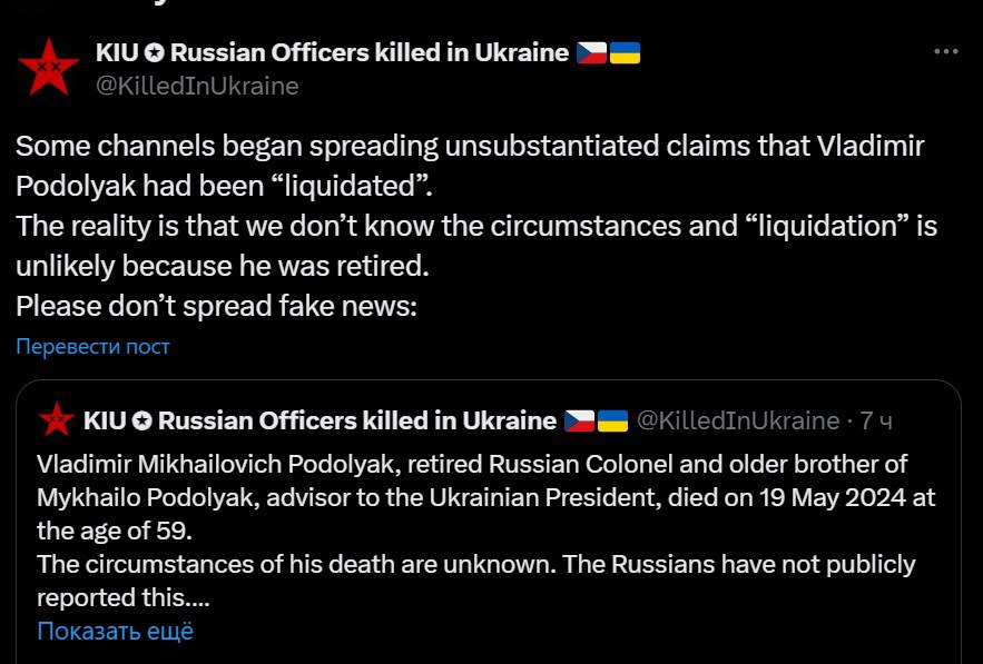 Паблик утверждает, что 59-летний полковник разведки был на пенсии. Он также опроверг информацию ряда украинских телеграм-каналов, что Подоляк-старший был убит на войне в Украине.