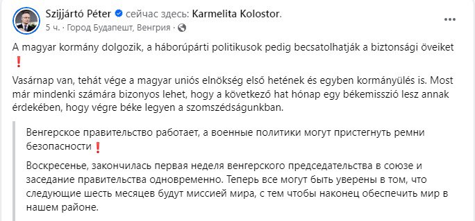 "Воскресенье, закончилась первая неделя венгерского председательства в союзе и заседание правительства одновременно. Теперь все могут быть уверены в том, что следующие шесть месяцев будут миссией мира, с тем чтобы наконец обеспечить мир в нашем регионе. Миссия мира продолжается и даже становится сильнее, поэтому я прошу европейских политиков, которые поддерживают войну, пристегните ремни и следите за обновлениями на следующей неделе", - заявил глава МИД Венгрии.