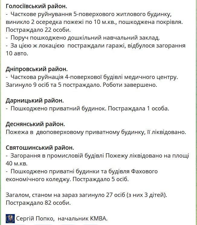 19.13 Подробную информацию о жертвах сегодняшнего ракетного удара по Киеву и разрушениях в городе опубликовала КГВА.