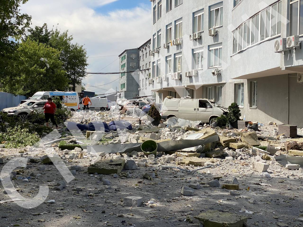 В Соломенском районе есть попадание в бизнес-центр, сообщается об одном погибшем. Коммерческие фирмы занимают первые этажи здания, на остальных этажах - жилые помещения. Разрушены 12-13-й этажи.