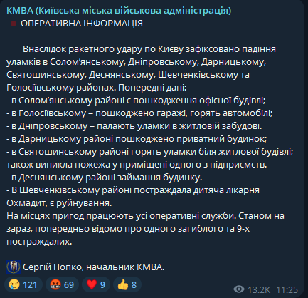 В результате ракетного удара по Киеву зафиксировано падение обломков в Соломенском, Днепровском, Дарницком, Святошинском, Деснянском, Шевченковском и Голосеевском районах.