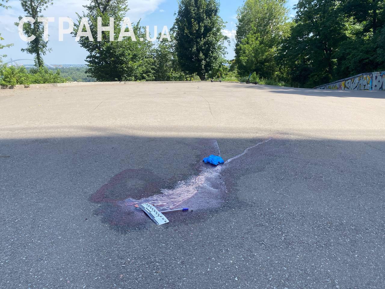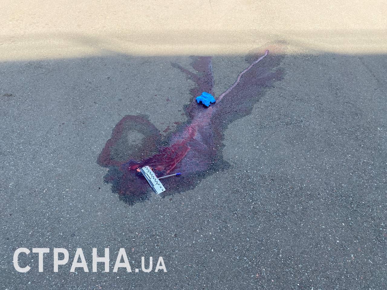 На место трагедии отправился корреспондент "Страны". К его приезду правоохранители уже забрали тело молодого мужчины. На месте падения остались большое пятно крови, медицинские перчатки и полицейская масштабная линейка.