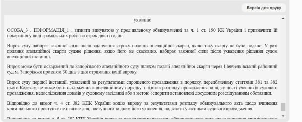 В ходе следствия женщина вину признала и раскаялась. Суд признал жительницу Запорожья виновной по ч. 1 ст. 190 УК Украины. Ей присудили 200 часов публичных работ.