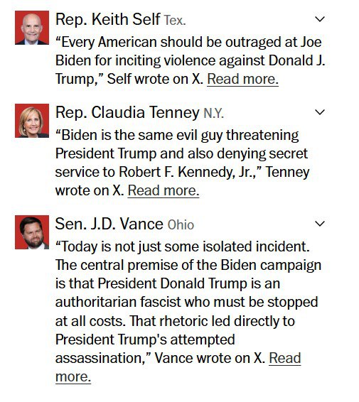 Эти слова Байдена также вспомнили член Палаты представителей Лорен Боберт, Ник Лалота и другие. Конгрессмен Майк Коллинз призвал прокурора округа Батлер, где произошло покушение, предъявить обвинения Джозефу Р. Байдену за подстрекательство к убийству.