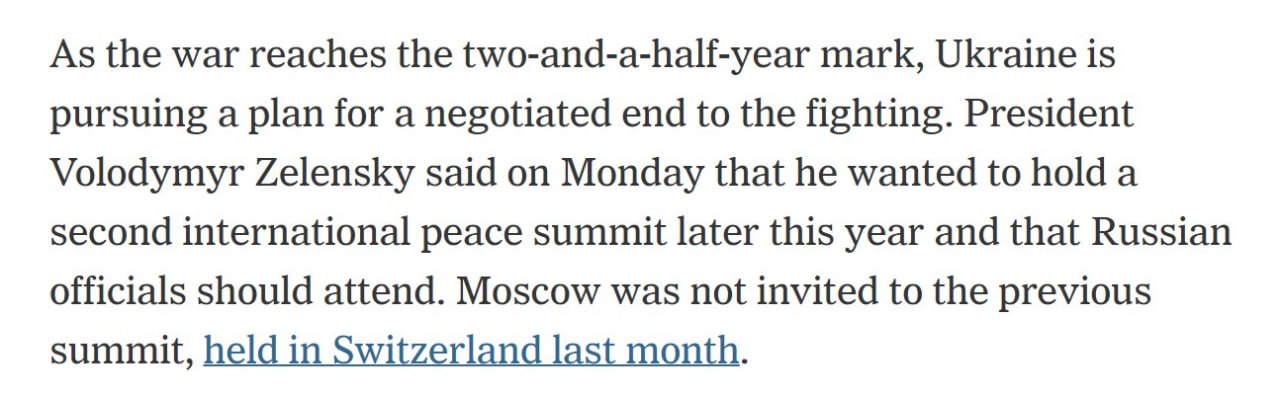 "По мере того как война приближается к отметке в два с половиной года, Украина реализует план прекращения боевых действий путем переговоров. Президент Владимир Зеленский заявил в понедельник, что хочет провести второй международный саммит мира в конце этого года и что российские официальные лица должны принять в нем участие", - говорится в материале издания.
