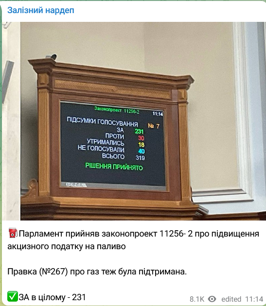 "Правка (№267) о газе тоже была поддержана. "За" в целом - 231 голос", - написал Железняк.