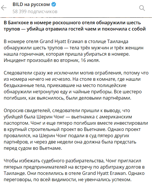 В роскошном отеле Бангкока Grand Hyatt Erawan горничная обнаружила шесть трупов: трёх мужчин и трёх женщин.