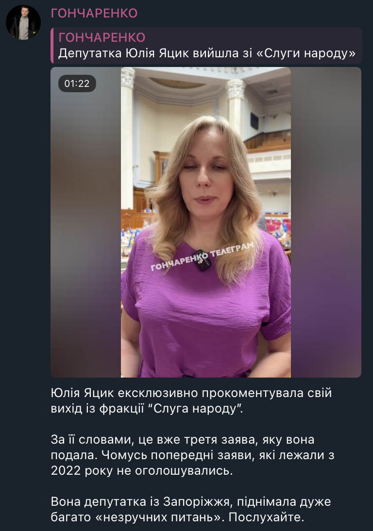 В комментарии нардепу Алексею Гончаренко Яцик заявила, что это была ее третья попытка выйти из фракции, а прошлые, которые лежали с 2022, не оглашались.