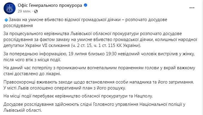 Между тем Офис генпрокурора заявил, что Фарион была доставлена в больницу с проникающим огнестрельным ранением головы в крайне тяжелом состоянии.