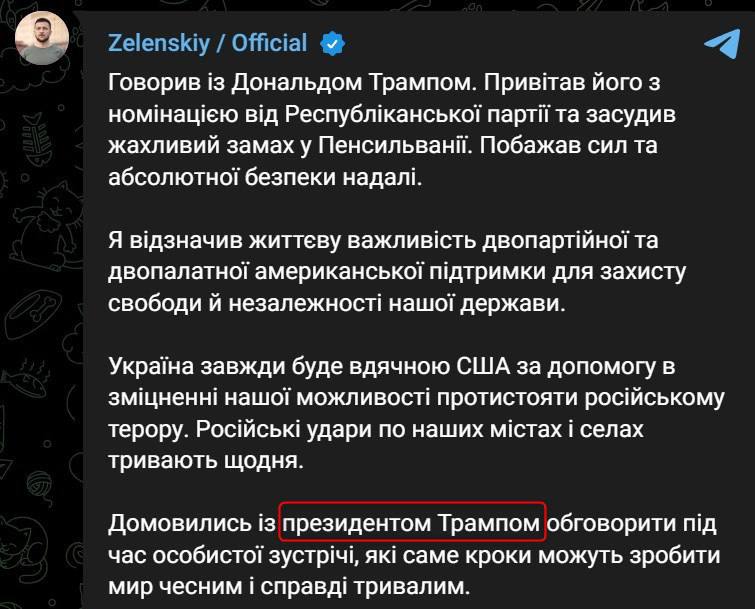 Зеленский в своем сообщении о телефонном разговоре с Трампом назвал его президентом.