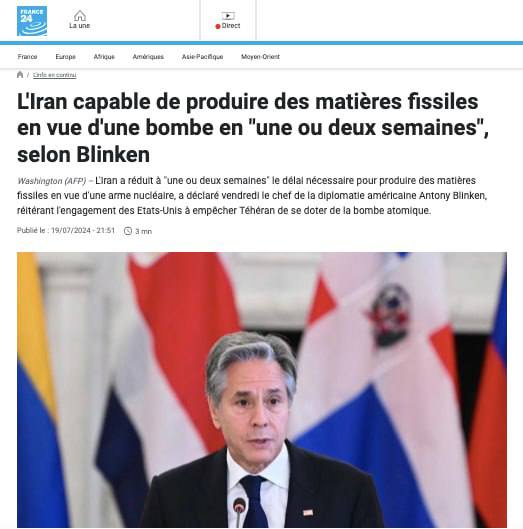 Госсекретарь США Энтони Блинкен заявил, что Иран "в течение пары недель" способен произвести расщепляемый материал для применения его в ядерном оружии.