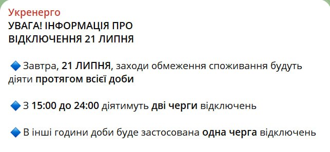 Между тем появилась информация от "Укрэнерго" об отключениях света 21 июля: