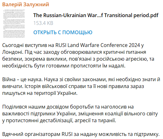 Выступление состоялось в британском оборонном институте RUSI. Его текст Залужный разместил в своём телеграм-канале.