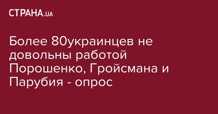 Согласно исследованию, лишь 16% довольны работой президента. Подобная ситуация и с оценкой деятельности премьер-министра Владимира Гройсмана - 16% респондентов заявили, что довольны его деятельностью, 78% - не довольны. Деятельностью Председателя Верховной Рады Андрея Парубия довольны практически 11%, не удовлетворены - 82%.