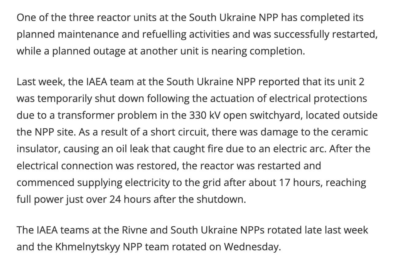 "На прошлой неделе группа МАГАТЭ на Южно-Украинской АЭС сообщила, что ее блок № 2 был временно остановлен после срабатывания электрических защит из-за проблемы с трансформатором в открытом распределительном устройстве 330 кВ, расположенном за пределами площадки АЭС.