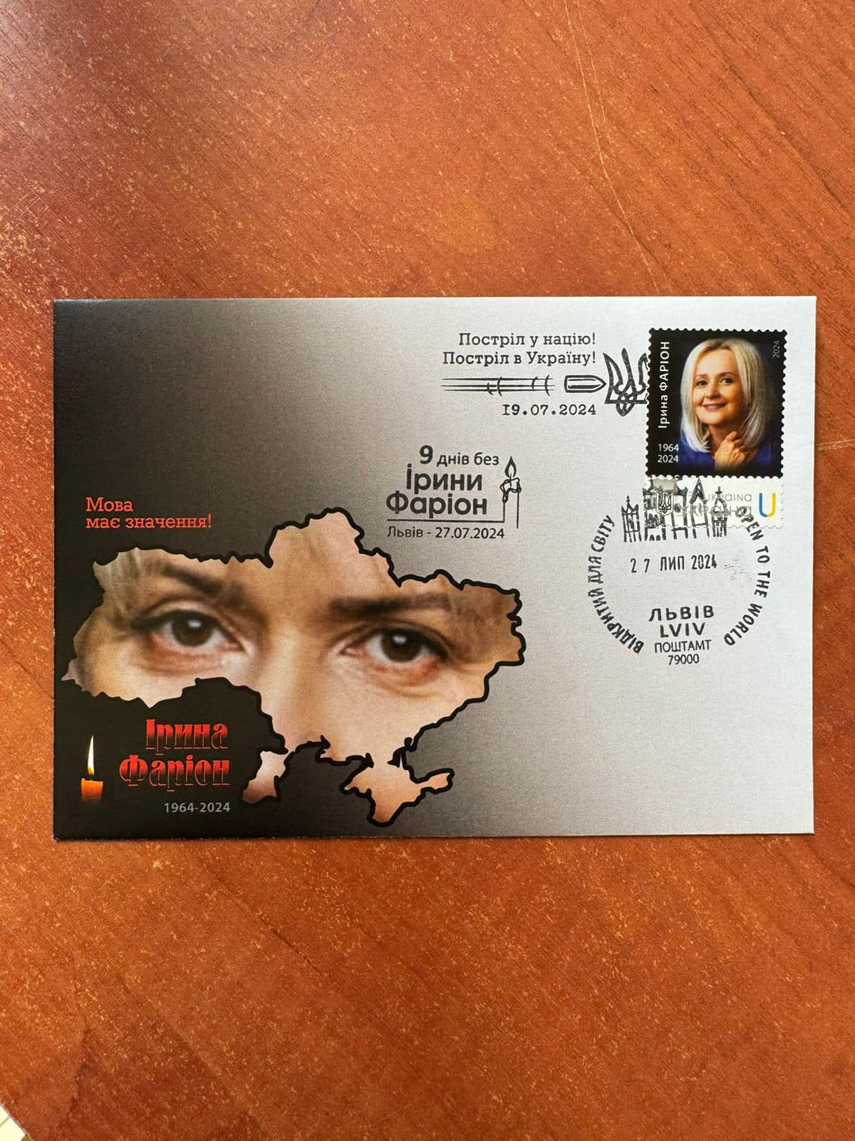 На конверт нанесены надписи: "Язык имеет значение", "Ирина Фарион", "Выстрел в нацию! Выстрел в Украину", "19.07.2024" (дата смерти Фарион) и "9 дней без Ирины Фарион". На марке с портретом известной своими радикальными взглядами Фарион изображен ее портрет и написаны годы жизни.