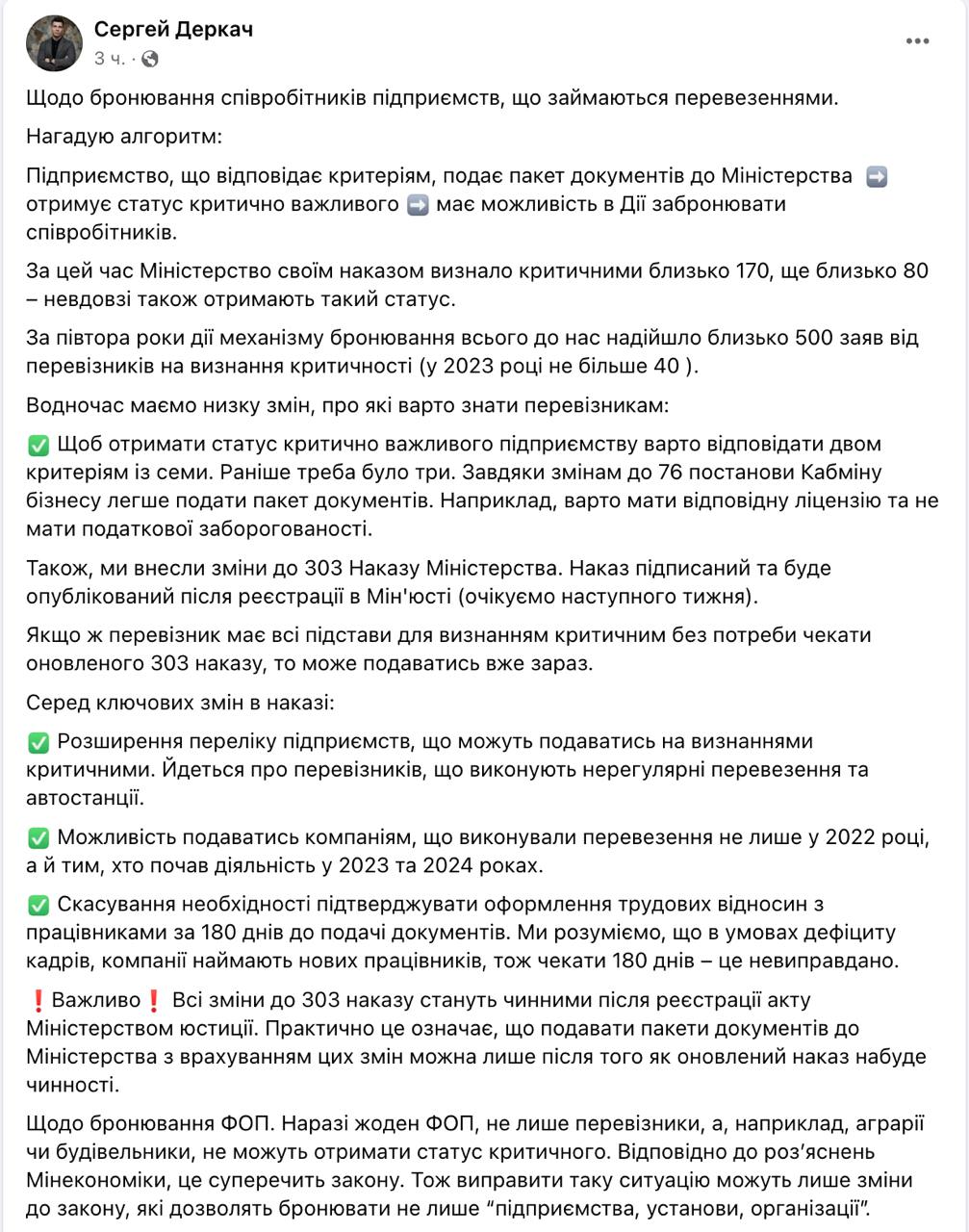 Для перевозчиков упрощают оформление брони от мобилизации сотрудников. Об этом сообщает заместитель министра развития общин, территорий и инфраструктуры Сергей Деркач.