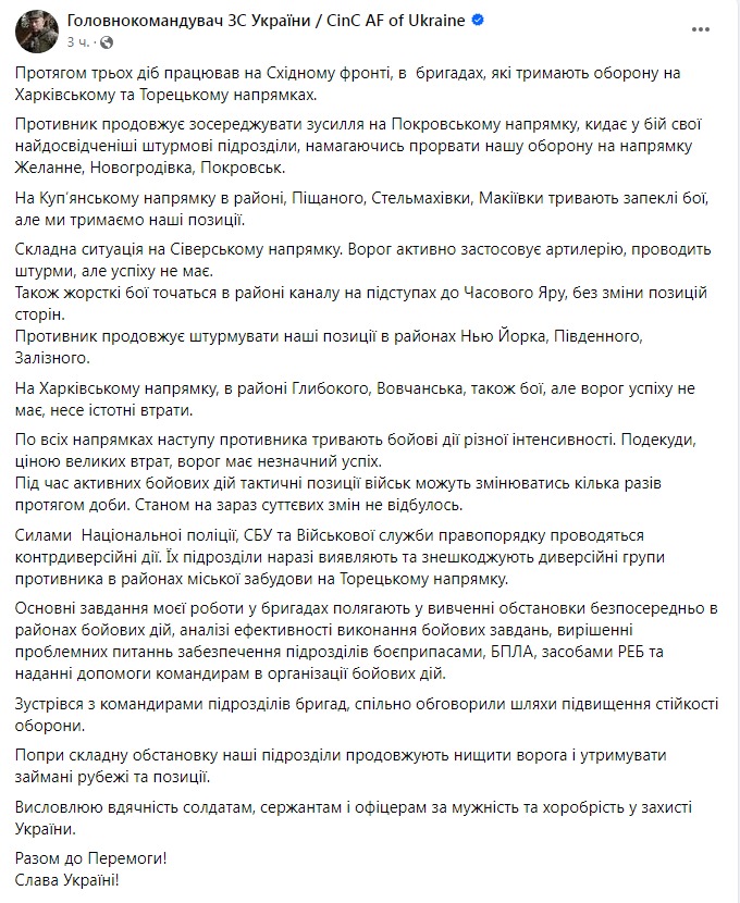 При этом он подтвердил, что россияне заходят в Торецк. Он пишет, что "диверсионные группы противника обнаруживают и обезвреживают в районах городской застройки на Торецком направлении".