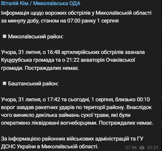 07:53 Россияне нанесли два ракетных удара по Николаевской области, сообщил губернатор Виталий Ким.