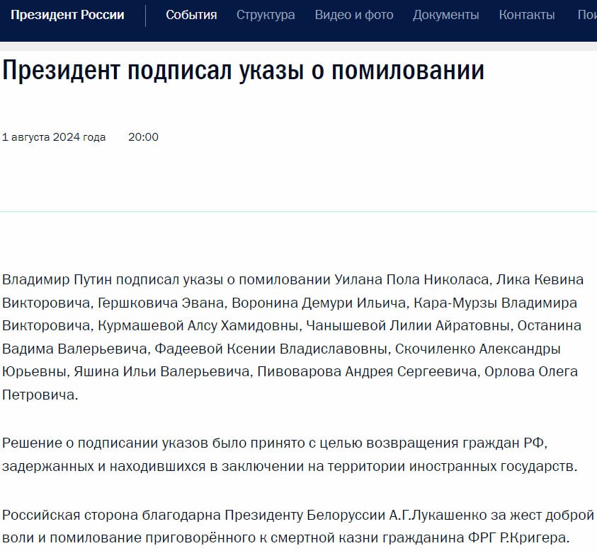 Затем в Кремле заявили, что Владимир Путин подписал указы о помиловании Пола Николаса Уилана, Кевина Викторовича Лика, Эвана Гершковича, Демури Ильича Воронина, Владимира Викторовича Кара-Мурзы, Алсу Хамидовны Курмашевой, Лилии Айратовны Чанышевой, Вадима Валерьевича Останина, Ксении Владиславовны Фадеевой, Александры Юрьевны Скочиленко, Ильи Валерьевича Яшина, Андрея Сергеевича Пивоварова и Олега Петровича Орлова.