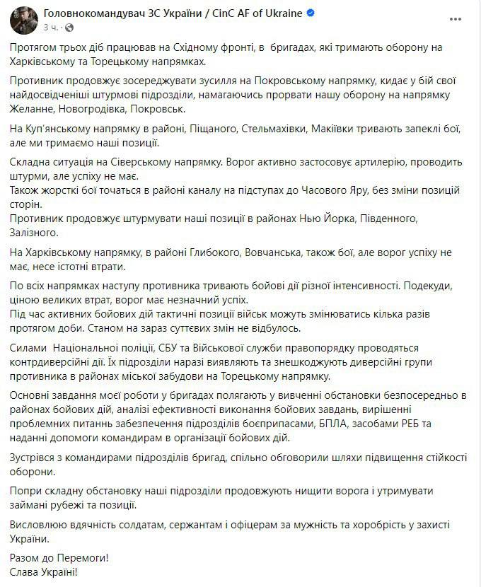 Между тем упомянутый нардепом главком ВСУ Александр Сырский в своих соцсетях сегодня признал, что РФ "кое-где" имеет "незначительный успех ценой больших потерь". Он подтвердил, что россияне заходят в Торецк, написал: "Диверсионные группы противника обнаруживают и обезвреживают в районах городской застройки на Торецком направлении".