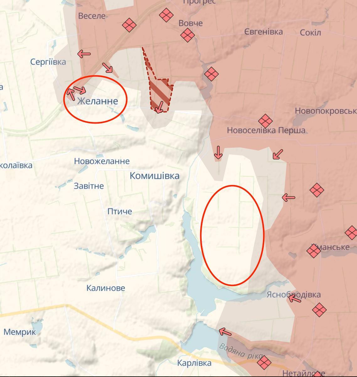 В частности, тактический успех РФ в районе Желанного и Сергеевки, которое россияне пытаются обойти, "ставит под угрозу" группировку ВСУ на восточном берегу реки Волчья.