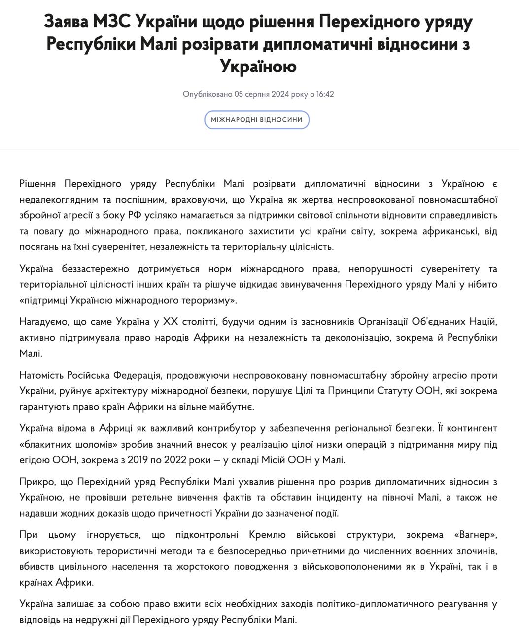 "Досадно, что переходное правительство Республики Мали приняло решение о разрыве дипломатических отношений с Украиной, не проведя тщательное изучение фактов и обстоятельств инцидента на севере Мали, а также не предоставив никаких доказательств причастности Украины к данному событию", - заявили в МИД Украины.