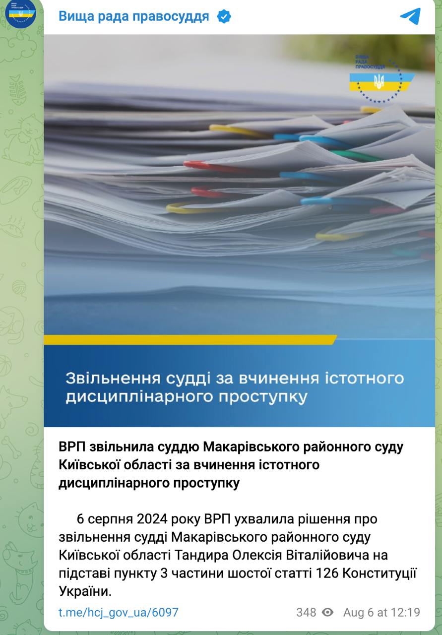 "6 августа Высший совет правосудия принял решение об увольнении судьи Кассационного административного суда в составе Верховного суда Князева Всеволода Сергеевича на основании пункта 3 части шестой статьи 126 Конституции Украины. 6 августа ВСП принял решение об увольнении судьи Макаровского районного суда Киевской области Тандыра Алексея Витальевича на основании пункта 3 части шестой статьи 126 Конституции Украины", - сказано в публикациях.