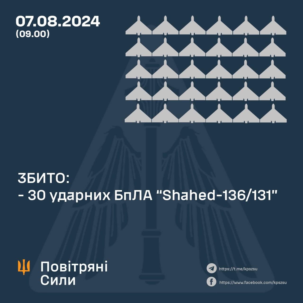 9.59 Этой ночью ВСУ сбили все 30 "Шахедов", сообщают Воздушные силы.