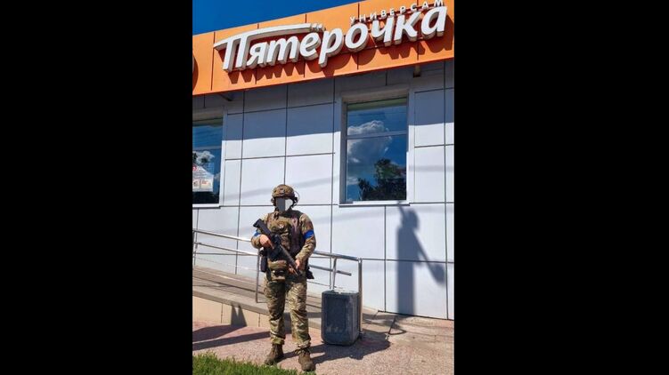 Человек в форме ВСУ стоит у магазина известной в России сети "Пятёрочка". Судя по карте, этот небольшой универмаг расположен на западной окраине города, где Минобороны РФ подтверждало наличие украинских войск.