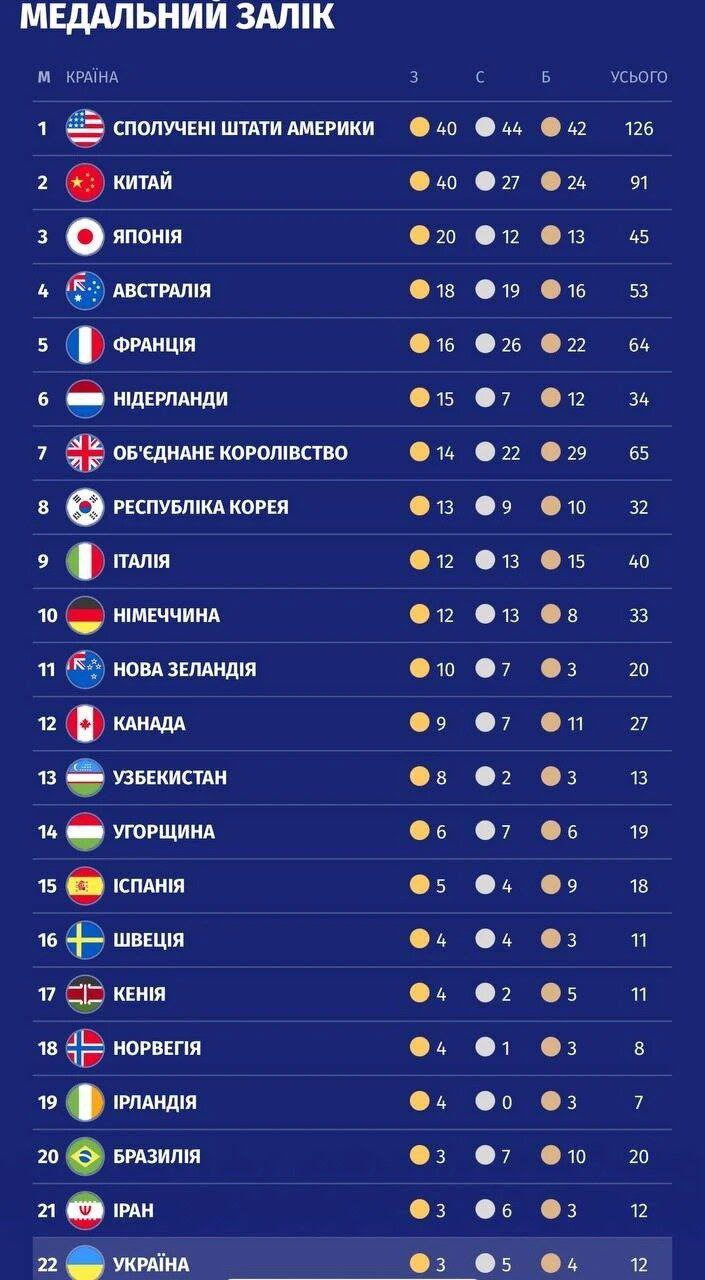 Украина по медалям заняла 22 место с общим числом в 12 медалей (из них три золотых).