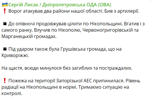 "Пожар на территории Запорожской АЭС прекратился. Уровень радиации на Никопольщине в норме", - говорится в сообщении главы ОВА.