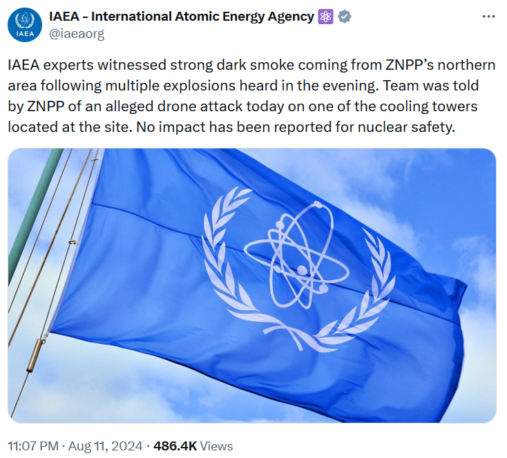 При этом сама РФ заявляет об атаке украинского беспилотника по градирне (и эту позицию также упоминает МАГАТЭ).