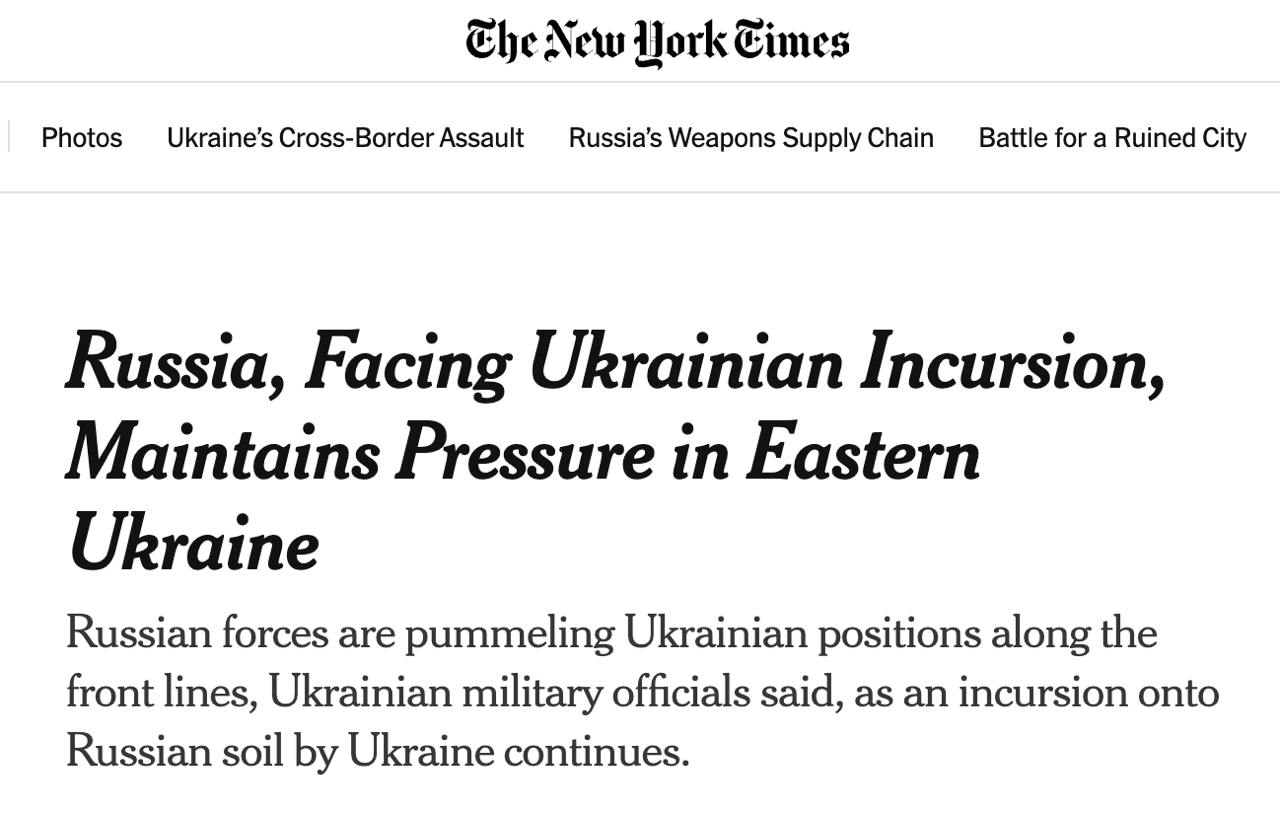 Ранее американские журналисты заявляли, что украинские подразделения, которые сейчас воюют в Курской области, были переброшены туда с Донбасса. Они ожидают падения Нью-Йорка Донецкой области уже в ближайшее время.