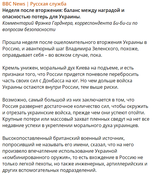 Высокопоставленный британский военный источник, попросивший не называть его имени, сказал, что на него произвело впечатление использование Украиной "комбинированного оружия", то есть вхождение в Россию не только легкой пехоты, но также инженерных, артиллерийских и других вспомогательных подразделений.