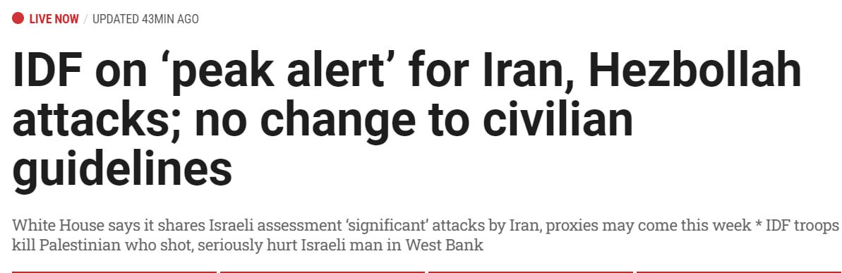 Напомним, что источники в регионе заявили телеканалу Fox News о своей обеспокоенности тем, что Иран и его доверенные лица могут атаковать Израиль в течение следующих суток в ответ на убийство политического лидера ХАМАС Исмаила Хании в Тегеране в конце прошлого месяца.