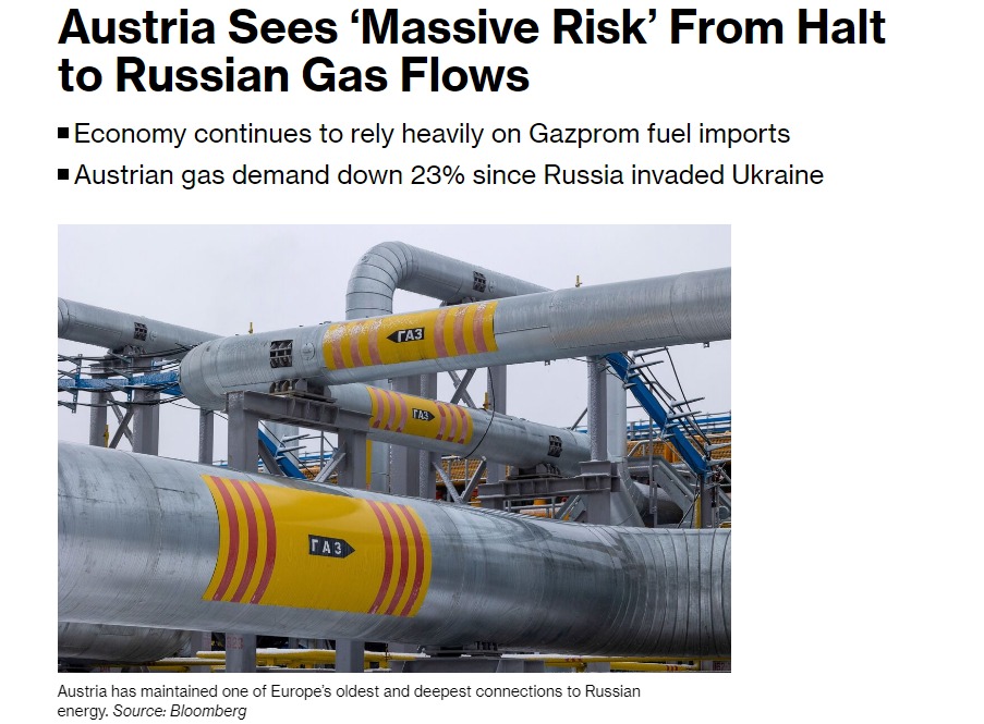 Экономика страны продолжает в значительной степени зависеть от импорта "Газпрома", хотя спрос на газ в Австрии упал на 23% после вторжения РФ в Украину.