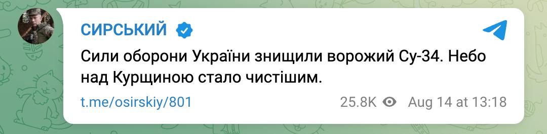 Между тем Сырский в своем телеграм-канале сообщил, что ВСУ сбили российский истребитель Су-34. Он намекнул, что это произошло в Курской области.