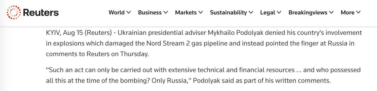 Советник главы Офиса президента Михаил Подоляк отрицает причастность Украины к подрыву "Северных потоков" и заявляет, что это сделала Россия.