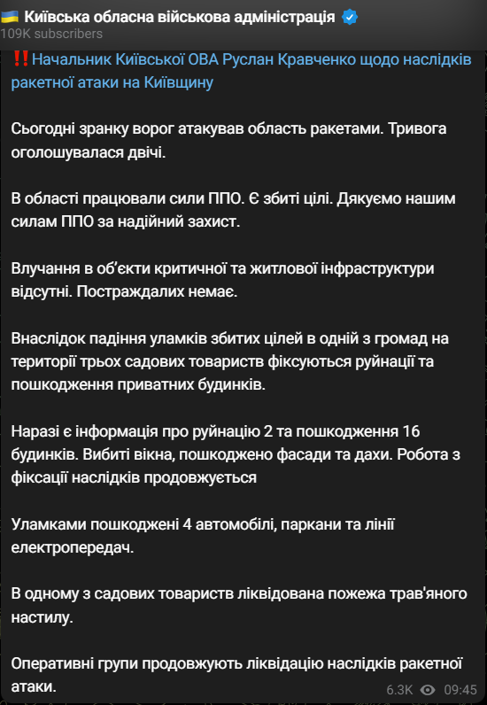 В Киевской области из-за падения обломков ракет и дронов пострадали 18 частных домов - два из них разрушены полностью.