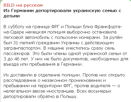 По данным издания, в субботу немецкая полиция на границе ФРГ и Польши остановила автомобиль с польскими номерами. За рулём был 31-летний гражданин Украины с действующим загранпаспортом. Всего в машине находились семь пассажиров: члены одной украинской семьи в возрасте от 3 до 46 лет. У них не было документов, необходимых для въезда в Германию или пребывания в стране. Поэтому их доставили в отделение полиции, а затем депортировали обратно в Польшу.