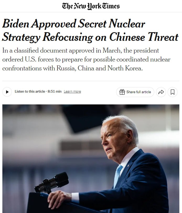 Как пишет издание, Байден в марте одобрил засекреченную ядерную стратегию США, которая впервые говорит о плане по сдерживанию Китая на фоне роста ядерных арсеналов КНР, а также о подготовке к скоординированным вызовам со стороны Пекина, Пхеньяна и Москвы.