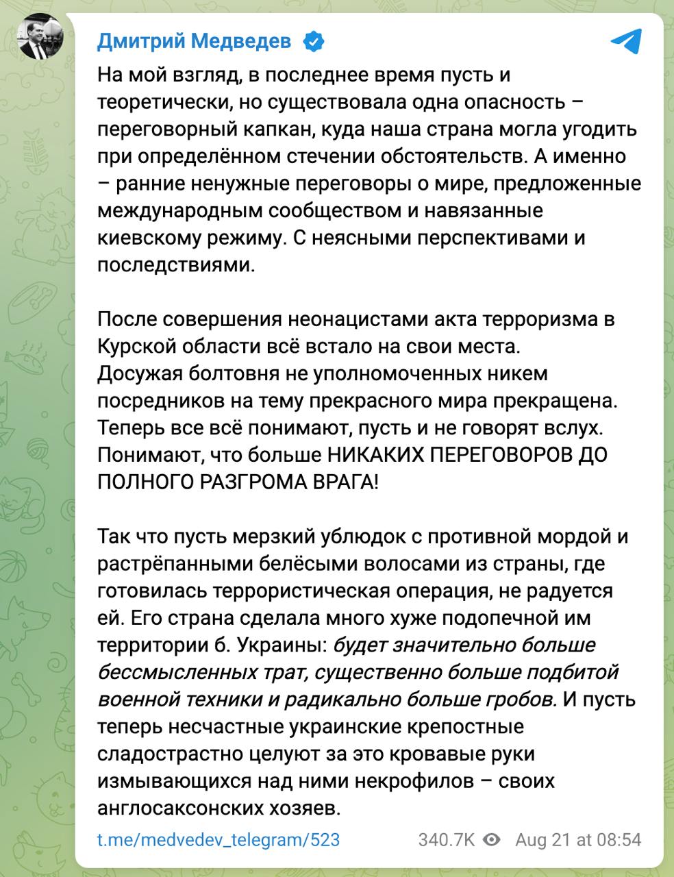 "В последнее время пусть и теоретически, но существовала одна опасность – переговорный капкан, куда наша страна могла угодить при определённом стечении обстоятельств. А именно – ранние ненужные переговоры о мире, предложенные международным сообществом и навязанные киевским властям. С неясными перспективами и последствиями. После совершения акта терроризма в Курской области всё встало на свои места", - заявил Медведев.
