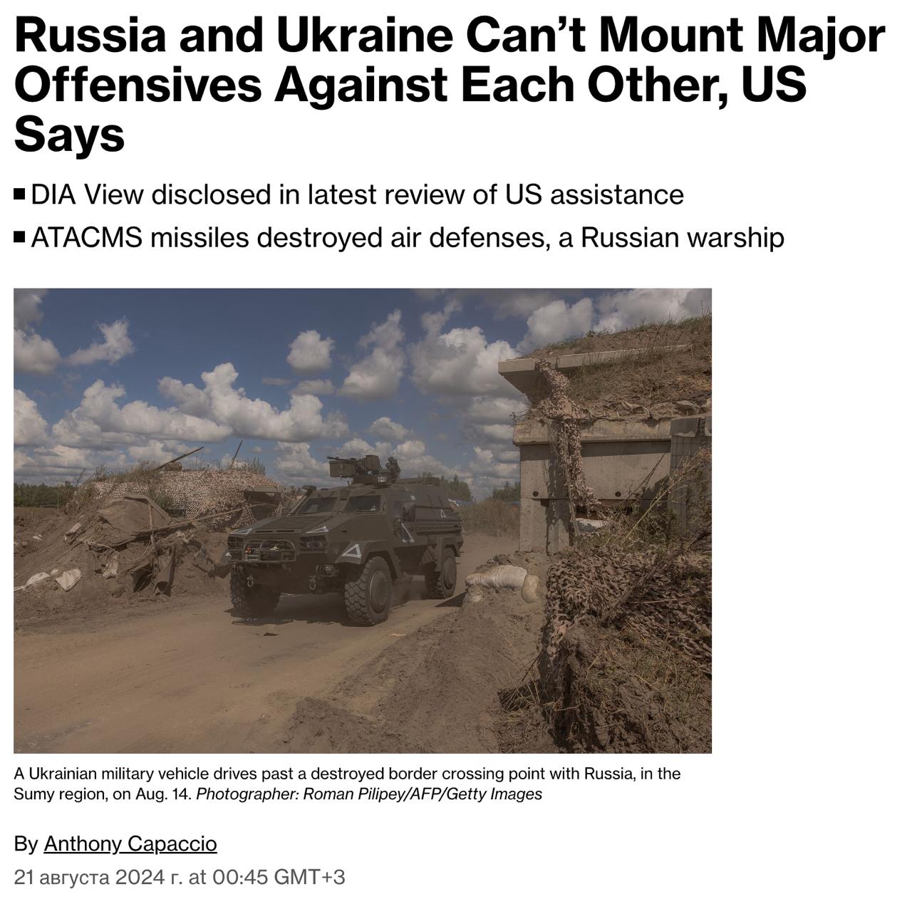 По данным Bloomberg, Агентство военной разведки не видит достаточных военных ресурсов ни у Украины, ни у России для проведения масштабных наступательных операций.