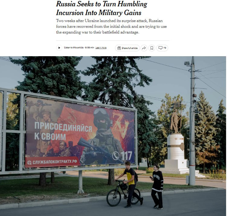 20.40 Россия стремится превратить унизительное вторжение в Курскую область в военные успехи, пишет The New York Times.