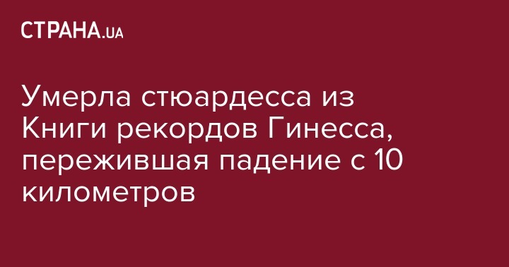 Сербская бортпроводница, вошедшая в Книгу рекордов Гиннеса после того, как она пережила падении в 1972 году с 10 тысяч 160 метров, скончалась в Белграде. Об этом сообщает Радио и Телевидение Сербии.